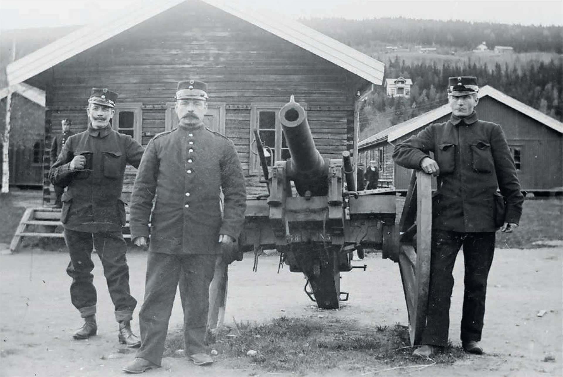 Medlemmer av Gudbrandsdalens Landstormsbatteri hadde kanonstilling på Sundsrud i september 1905. Sersjant Nils Linnerud, i midten var 1. pelotonsjef og bodde hos Nina og Halvor Sundsrud. Til venstre sersjant Olaf Moen, sjef for 2.tropp, og til høyre sersjant Hovden, sjef for 1.tropp. Det var en spent tid mens forhandlingene foregikk i Karlstad. Stor var lettelsen da beskjeden kom om at det ikke ble noen krig. Bildet er trolig fra Gudbrandsdalen.