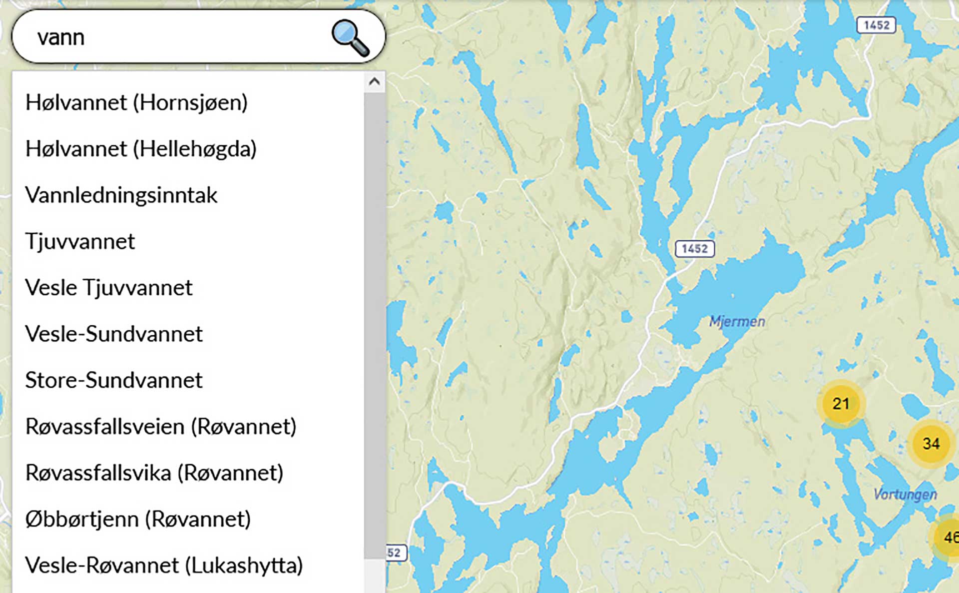 Sirklene med tall i kartet viser hvor mange stedsnavn som er samlet i det aktuelle området. Når du zoomer inn, vil sirklene dele seg opp og vise flere enkeltpunkter. Du kan zoome ved å: