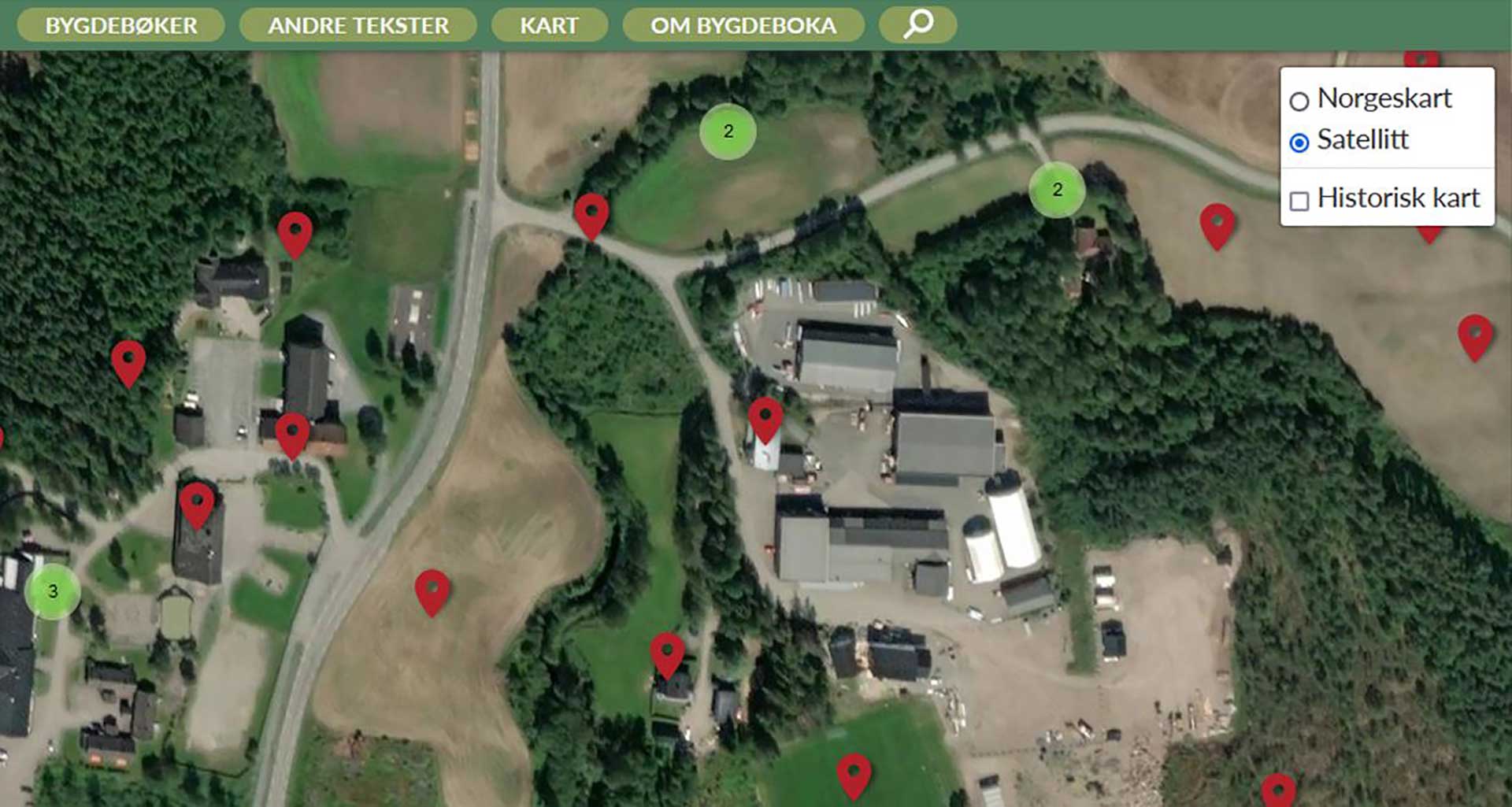 Klikk på ikonet øverst til høyre for å velge mellom ulike kartvisninger: Norgeskart, satellitt eller historisk kart.