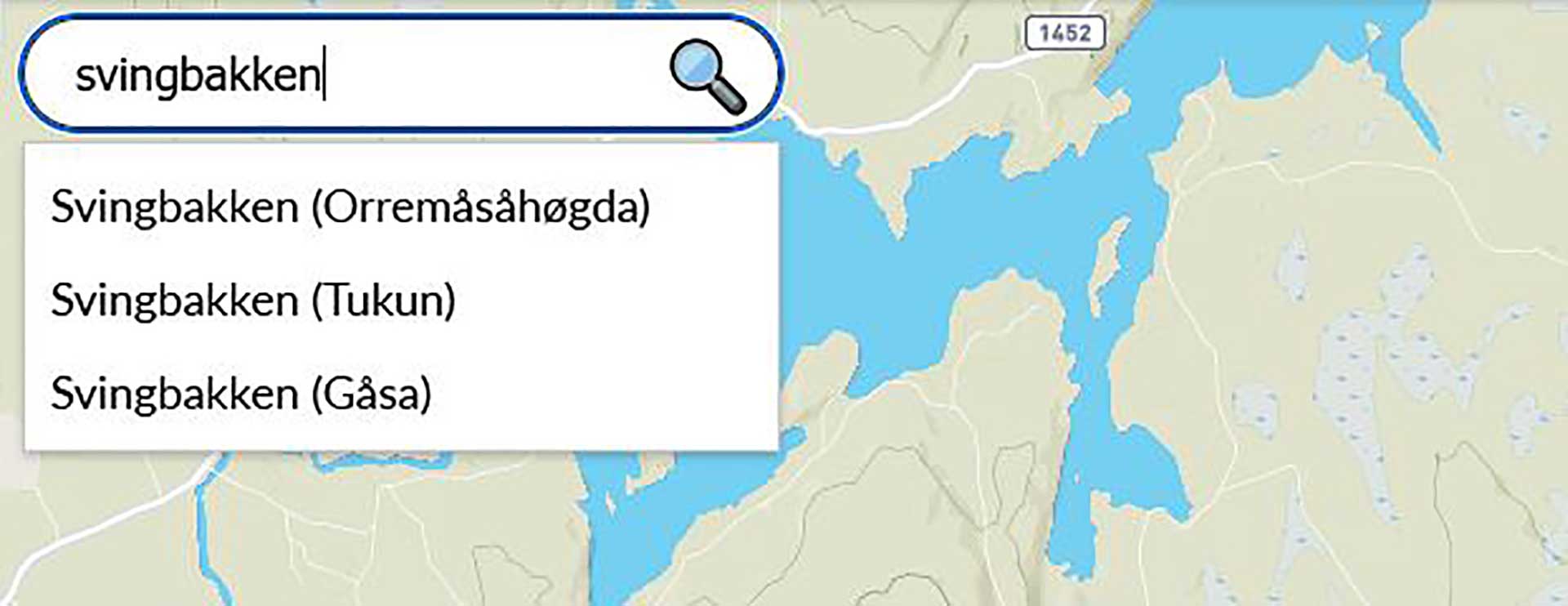 Omtrent 300 stedsnavn forekommer to eller flere ganger. Når du søker etter slike navn i kartet, vises området i parentes etter navnet, slik at du enkelt kan skille mellom dem.